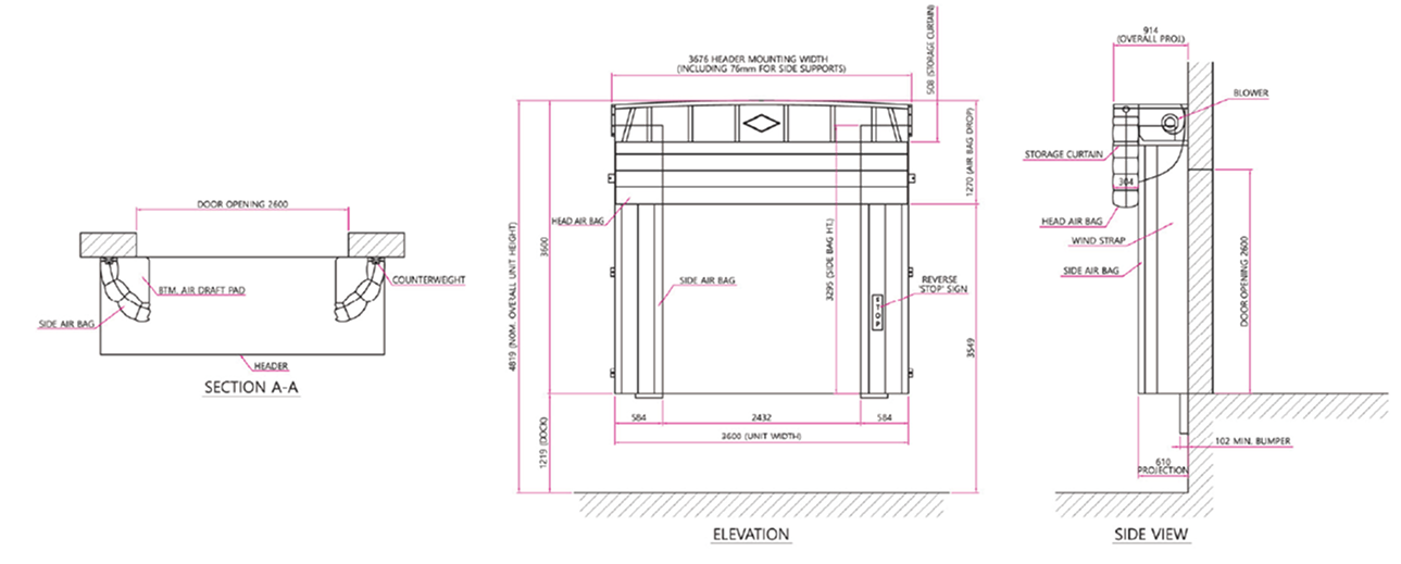 ①수직에어백, ②상부에어백, ③모터/블로어, ④헤드프레임, ⑤에어덕트, ⑥수직프레임, ⑦상부커버, ⑧감김장치, ⑨앵글마감, ⑩전면커버, ⑪황색띠, ⑫전면 가드