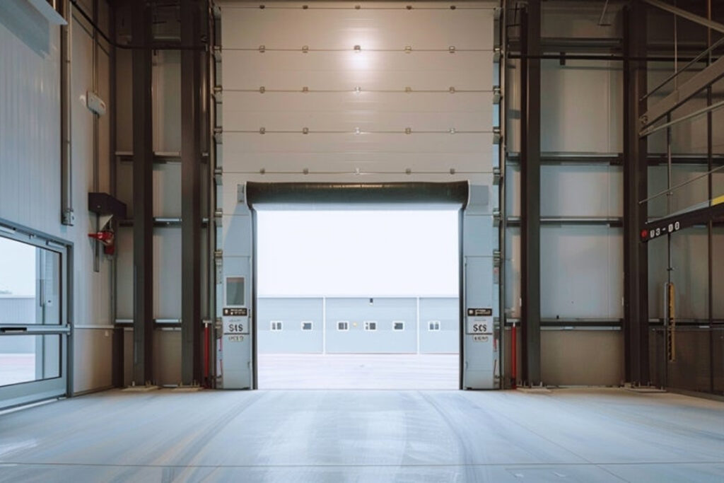 수직 상승한 패널이 나선형의 레일연장부에 수납되는 형태로 모터와 스프링에 의한 카운터밸런스로 작동되어 안정적이고 빠른 속도를 자랑합니다.