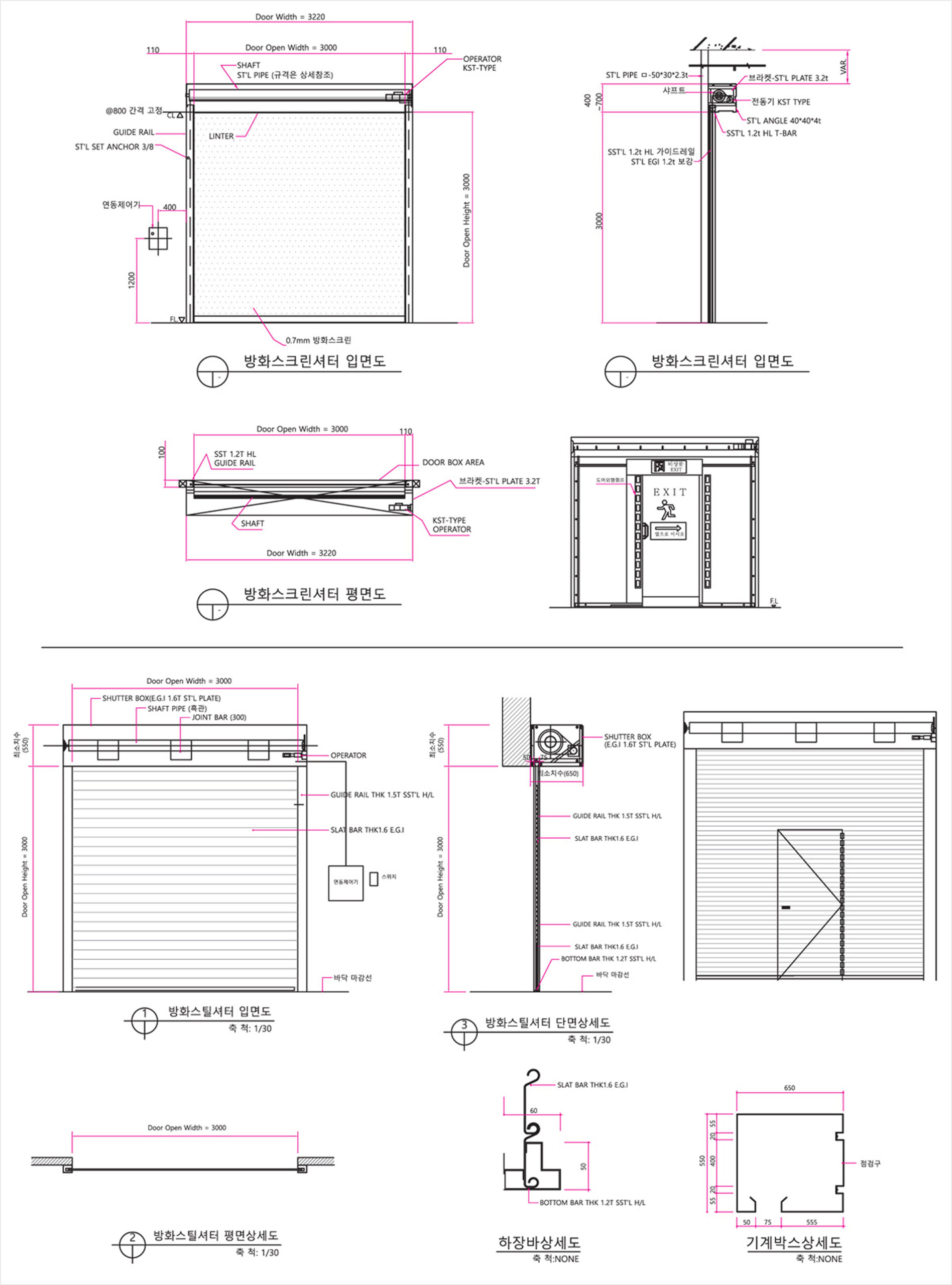 방화셔터는 소재에 따라 철재와 스크린 방화셔터로 구분됩니다. 철재의 경우 1.6T 아연도 강판을 슬래팅한 후 포밍한 슬랫을 사용합니다.
