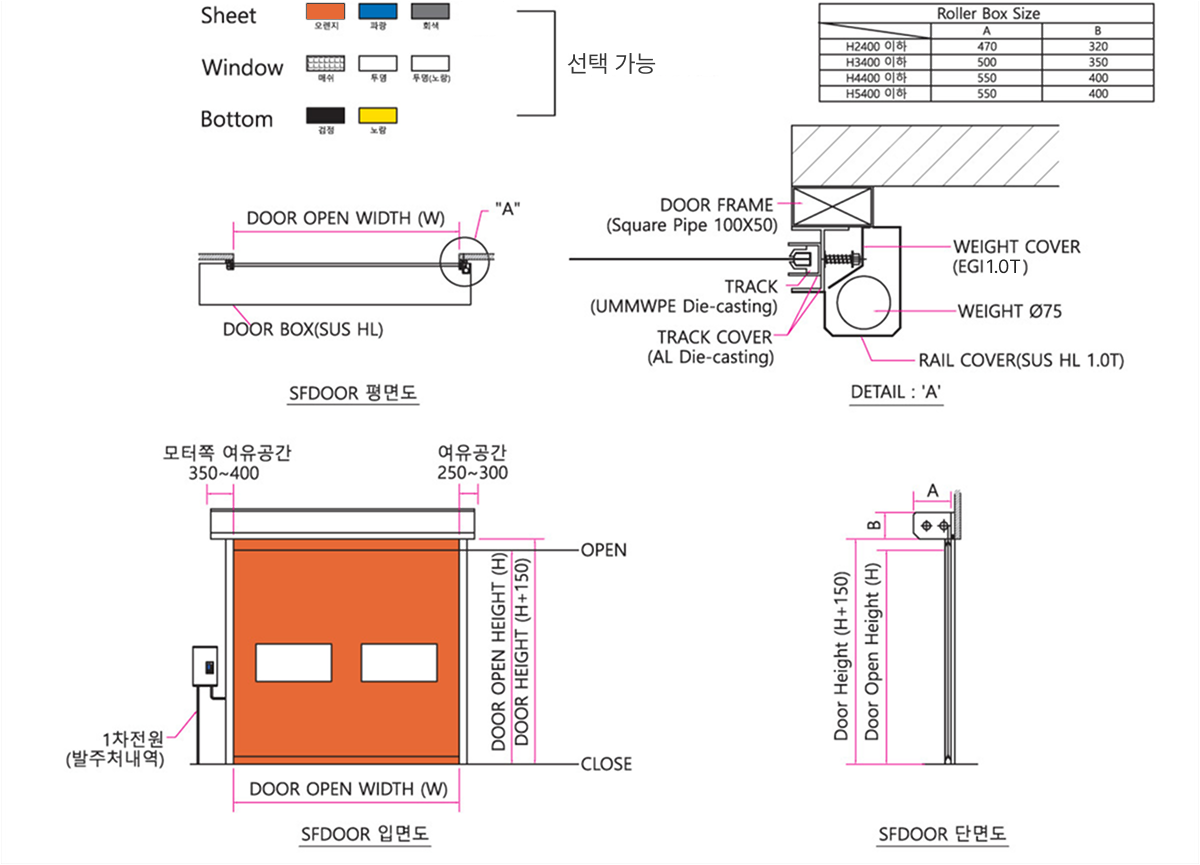 | Door Curtain | 연질 PVC + Fabric 0.9T 또는 2.0T (투명창 : Flexible PVC 투명 2.0T) |