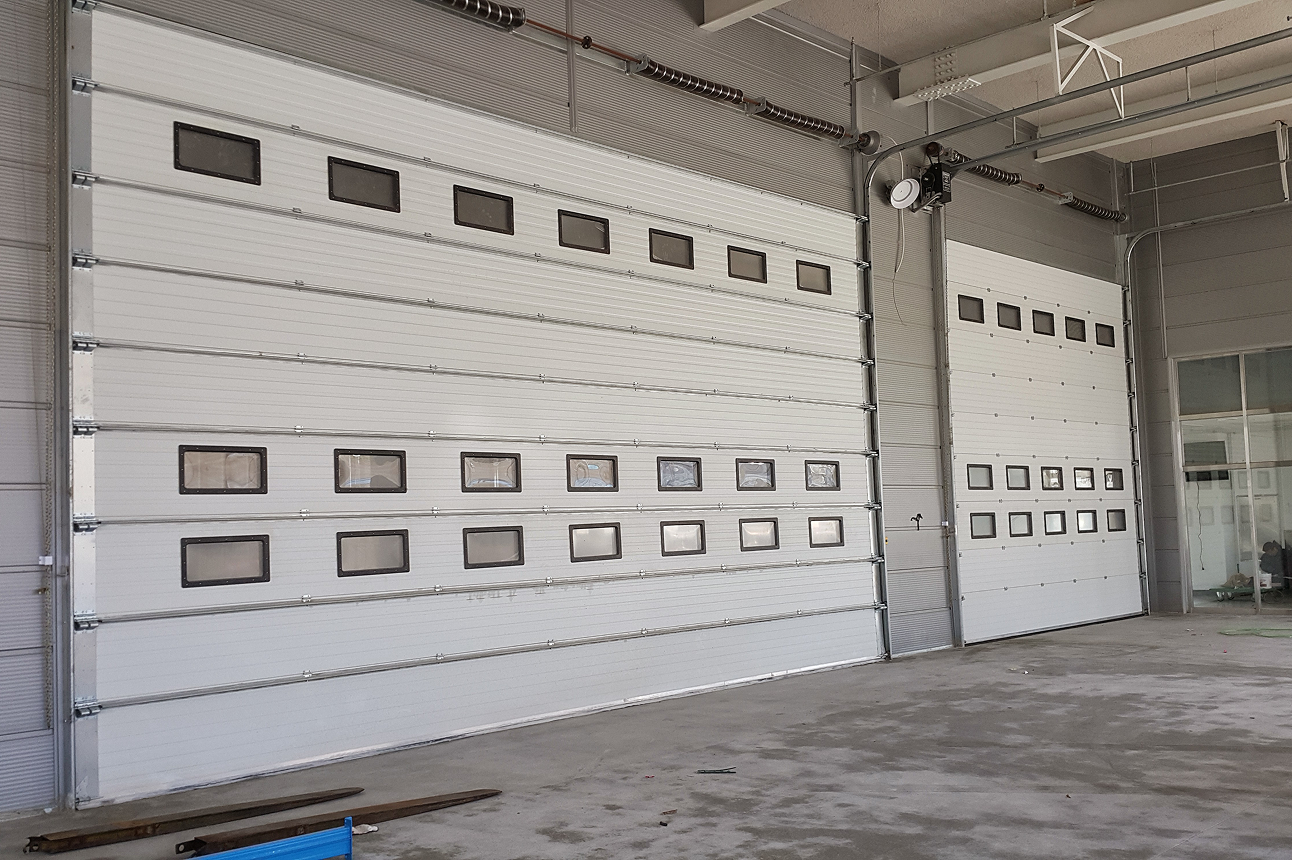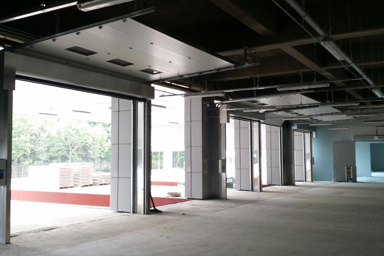 Panels stack vertically into the shutter box, preserving advantages of overhead doors (insulation, airtightness, security) while reducing ceiling space requirements.
